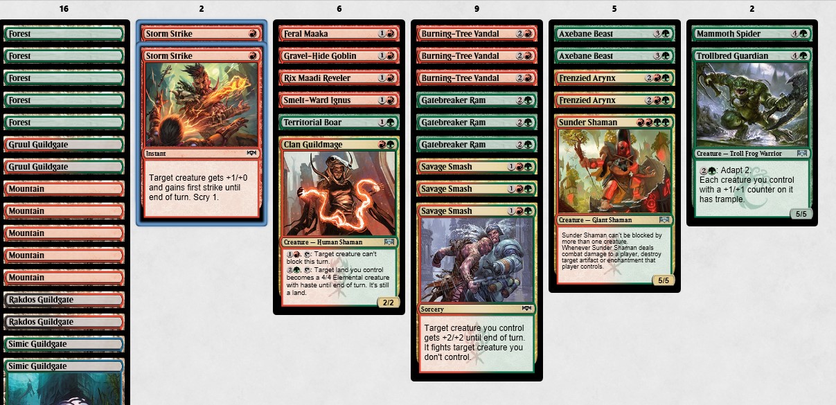 - Round 1 vs. Gruul: I win game 1 handily, but get ground down by Guardian Project in grame 2. That’s a lot of card advantage when trading creatures. Didn’t help that I stalled on 4 land. Then my oppo quit after a subpar attack? Very strange.