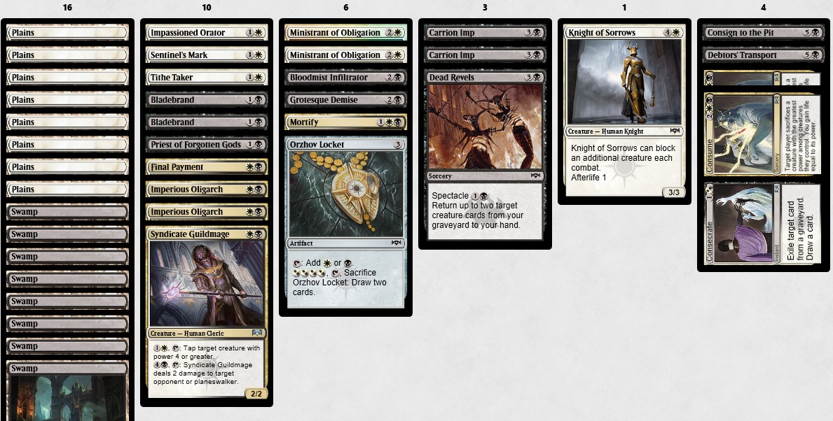 - Round 3 vs. Orzhov: Game 1 I grind out a deck playing worse Orzhov cards than I, which I hardly thought possible. Game 2 I mull to five, with only black mana. I continue to draw only black mana. Game 3 I fall behind and never really catch up. Felt like I lost to a bad deck, but then again, this deck was bad too. Can’t be salty about that.