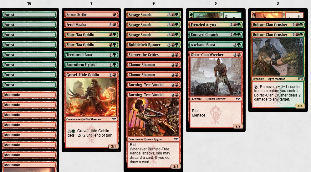 Looks very by-the-numbers Gruul deck. Three Savage Smashes and a archtypical 6-5-4 curve out. The ceiling doesn’t look particularly high, lacking powerhouse rares. Also a little sad I was never able to snag a Gruul Guildgate or two. But we’ll see!