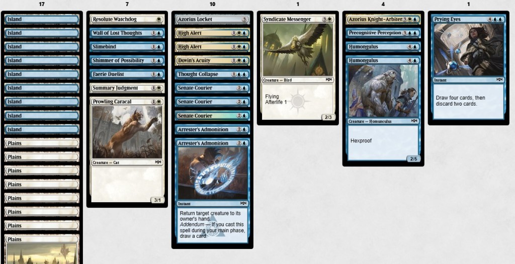 This was an interesting draft that I think speaks to the power of not overcommitting. It was a very murky first pack with some early gate payoffs and late blue playables, very little in the sense of “signals.” Then late Dovin’s Acuity and a pair of High Alerts put us in Azorius. I disagreed strongly with taking Windstorm Drake over Spirit of the Spires and I feel somewhat vindicated by the outcome.