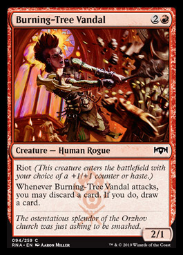 The Burning-Tree Vandal did not look great in theory. Three mana for 2/1 haste or 3/2 rarely lines up well (especially with 1/1 Spirits assumed to be floating about). But 2/1 was shockingly good in this format. The lack of 1/3s & 2/3s meant that the 2/1s were every bit as good as the generic 2/2, plus you get to rummage! Having BTVs as built in flood insurance really helped aggro decks prevent one of their surest paths to defeat.