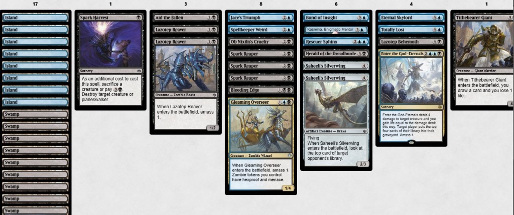 Okay, so Enter the God-Eternals is absolute gas. I was wrong to even wonder about it being worth committing to two colors that early. Spark Reaper was very solid, especially in long grinding matchups, picking off my own 1/1 zombie armies for value. Also keeping the threat of activation up when I know they have removal is a definite “feels bad”.