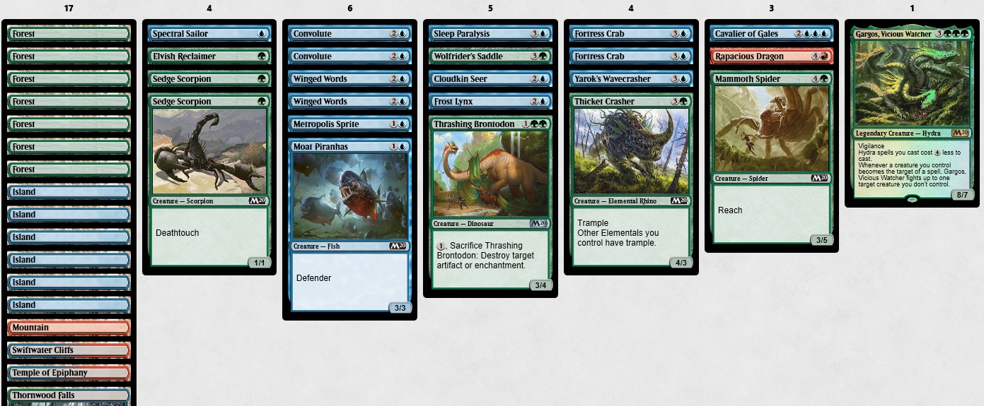 So the deck has a plan: stall, draw cards until you find a bomb. Control the ground, go slow, and grind it out. The big decision was whether or not to splash for the treasure dragon. Rule #5 is don’t splash for fixing. But given that there are two dual lands already, and the UUU/GGG bombs are the game plan, I can see the treasure tokens actually being quite useful.