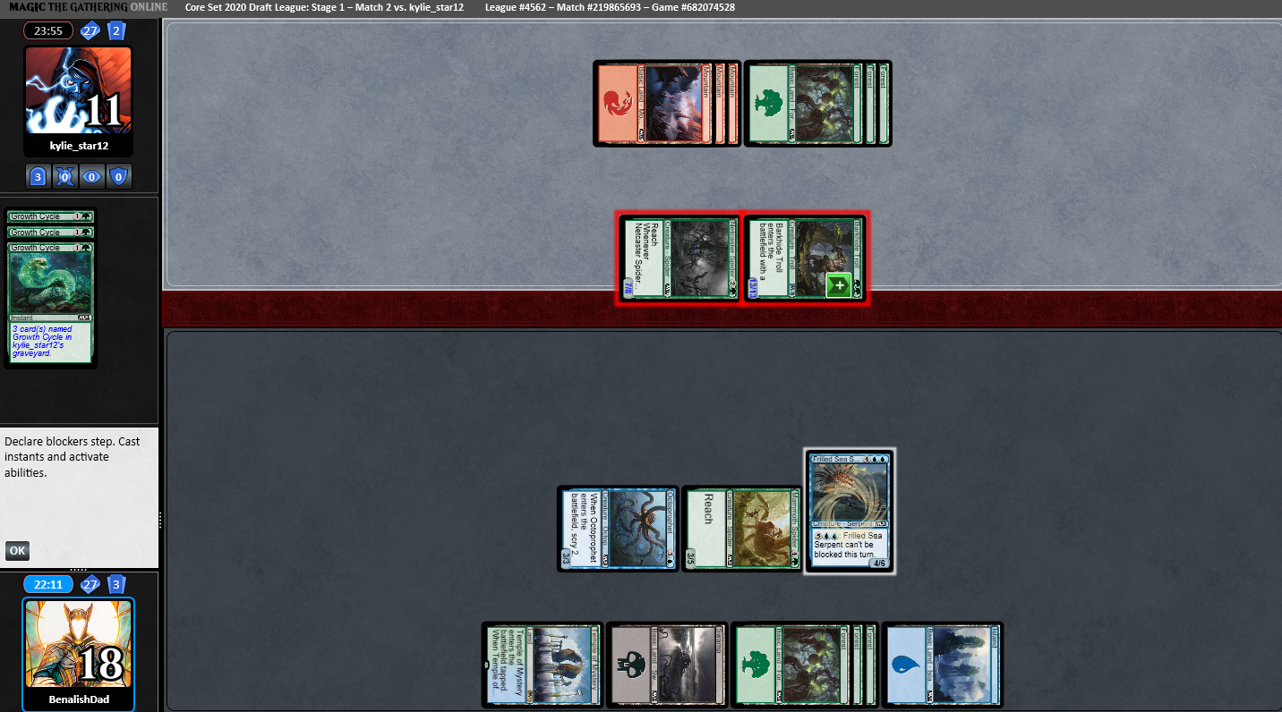- Round 2 vs RG: I get a fast start and oppo goes slow. I have my board and he attacks with two dummies. I don’t block with Sea Serpent because my life total is at 18, not worth losing a win-con when he’s representing a trick. Well, he then casts TRIPLE Growth Cycle to alpha me down. In game 2 I flooded out and he beat me in the face with Cavalier of Flame.
