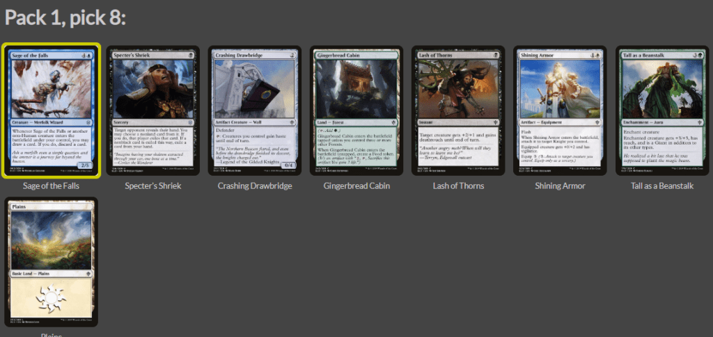 Really intresting pick here. I started in red and then the green started flowing (late Outmuscle and Garenbrig Paladin. Then this pick. There’s been some traces of blue (So Tiny &c) so it’s a choice between speculating on a pretty good blue card or a “eh” colorless. I took the Sage of the Falls as I think it’s a little late here and UG is definitely possible. It didn’t pan out and the rampy deck that I put together could have really used the Drawbridge, but I think it was the right choice.