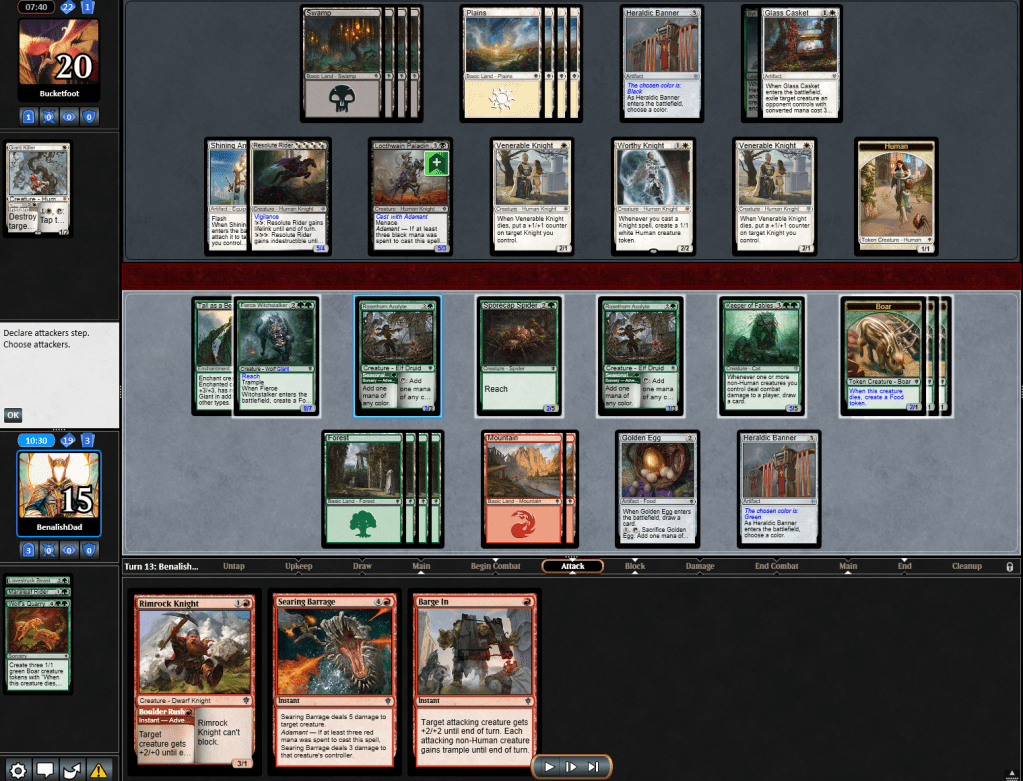 Is it time for an all-out attack? Too much mana for my Searing Barrage to ever snag the Resolute Rider, but I have a trick, a Barge In, and an extra three damage from Searing Barrage. I add it up and go for it! I then totally forgot about the 5 life they would gain from lifelink on the Rider, but it still turned out to be enough.