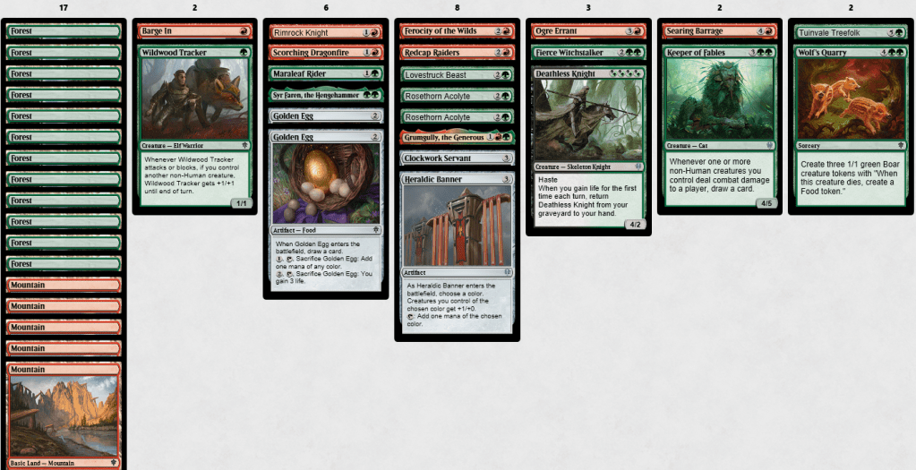 Very tricky draft to navigate. I veered pretty hard into red with the late Scorching Dragonfire and Ferocity of the Wilds. Felt a little bad when white and blue suddenly opened up in pack 3, but I think I made the right choices overall.