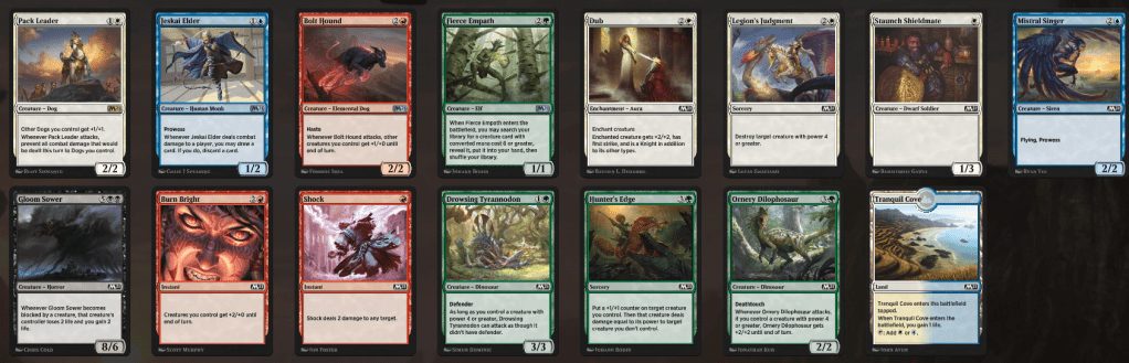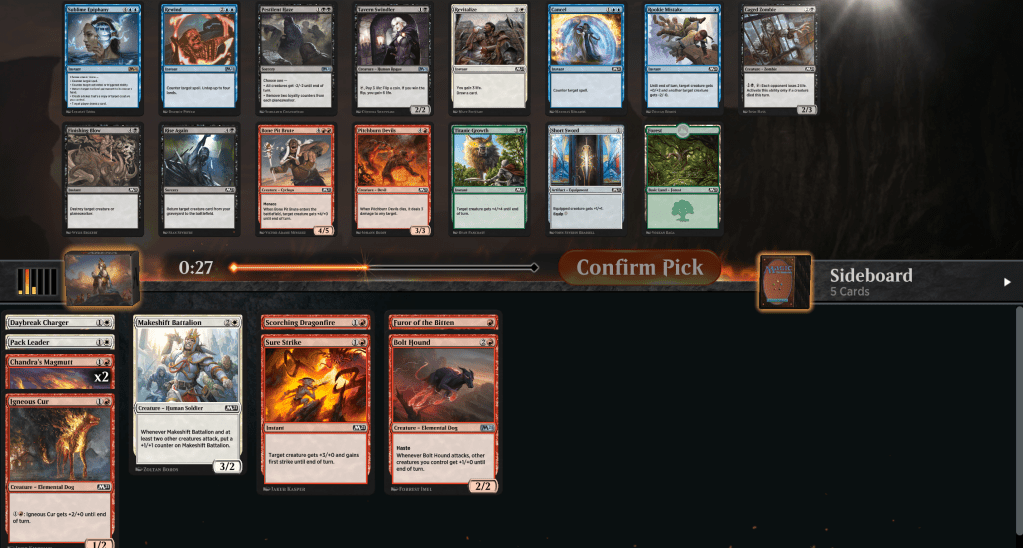 Pack one was medium red but all the two-drops, Pack 2 opened a sublime epiphany, which is hilarious and I’m miles away from playing. Depressingly cut in both red & white in pack 2, which surprised me as well. After blue was so empty in pack 1, a late whale and then good green. At first I worried that I was in the wrong lane but I felt like the deck came together “with a plan” surprisingly well.