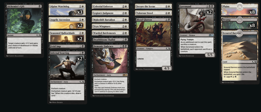 The deck is not without power: Demonic Embrace, Seasoned Hallowblade x2, Goremand x2, these are all cards that can win games of magic. I had some bad luck and didn’t draw my power but I’m also missing key cards. My removal is weak, no Feat of Resistance, etc. 0-2 was disappointing, but not surprising.