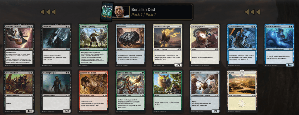 Well, a lot went wrong. I think I ended up in the unenviable of fighting for black at a table of M21. This… is not where you want to be with black. If you’re not getting late Grasp of Darkness, you’re not wherre you want to be. White seemed dry but then I got P3p2 and P3p3 Seasoned Hallowblade, which is ridiculous. So I guess BW was my seat but it sure didn’t feel great.