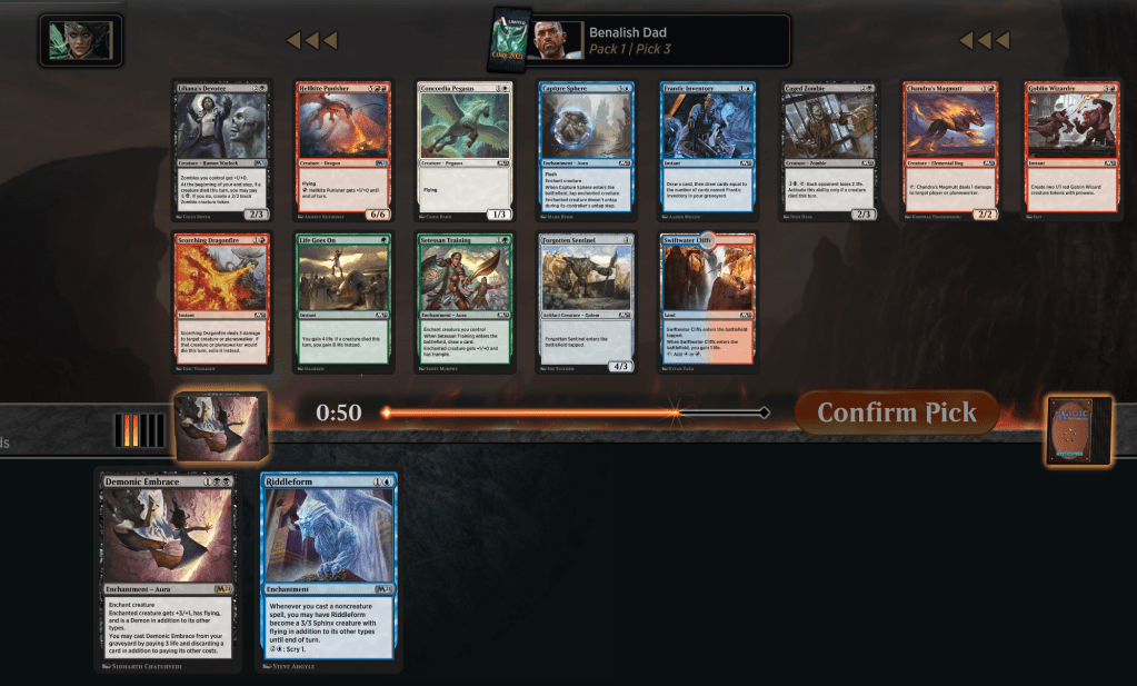 Scorching Dragonfire or Liliana’s Devotee? I think dragonfire is the better card in the vacuum, only because trying to be aggressive in black is a rough go in this set. However, with the very good (and aggressive) Demonic Embrace in P1p1, I probably should have tried to carve out a lane in black.