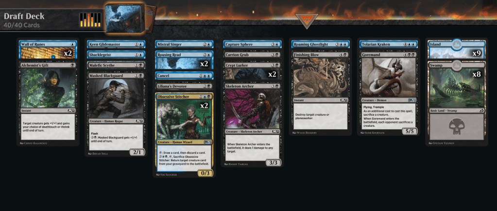 Well the deck SORT OF has a plan. A light reanimator theme with the Stichers with some control elements. Two Rousing Reads does a good Divination + win condition impression and my 4-drops were pretty good stabilizers. I beat a bad mono-red deck but lost in three to two pretty good decks.