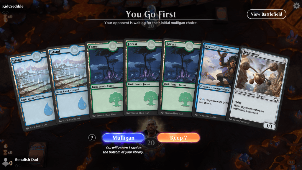 This feels like a classic “bad keep”. 5 lands is never ideal, but there’s early action and cantriping into another card. Result: 5 out of the next 6 cards were lands. I didn’t win this game you guys.