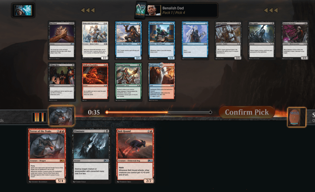 Terror of the Peaks is a pretty easy P1p1, a stone-cold bomb that’s worth fighting for. Interestingly, that choice came up with a quasi-empty pack a few picks later (see below). Some light green signals late in pack 1 gave me the fortitude to jump aggressively into green in pack 2. That proved to be the Right Decision.