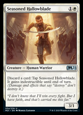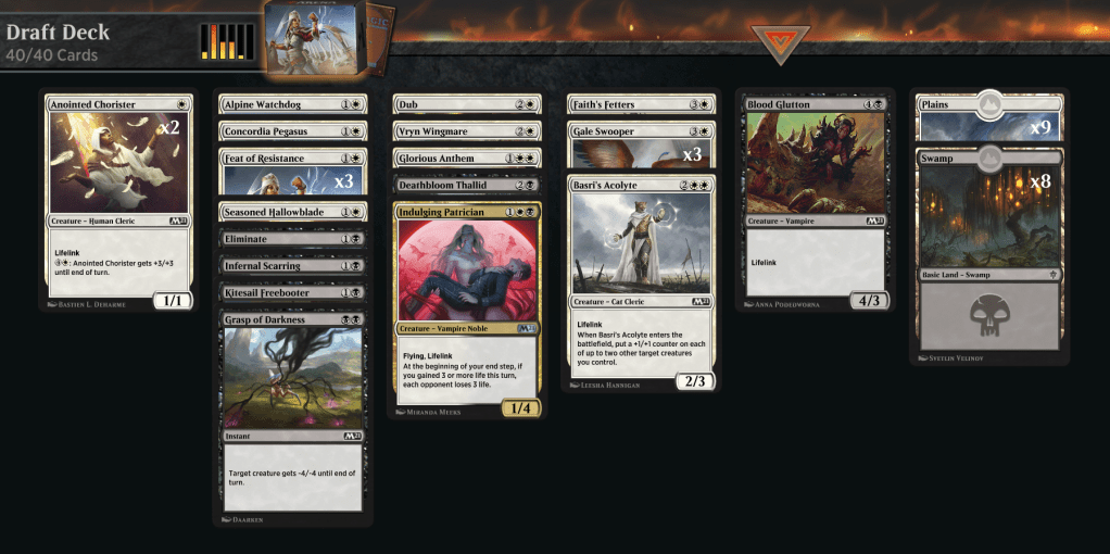 Lots of fun build choices! Splash the red for the Dragonfire? Kitesail Freebooter Y/N? Eventually I went with the most streamlined WB build seen above. Only one lifegain payoff, the Patrician, but lots of mini-synergies (enchantments on the Hallowblade or Chorister or Kitesail) etc.