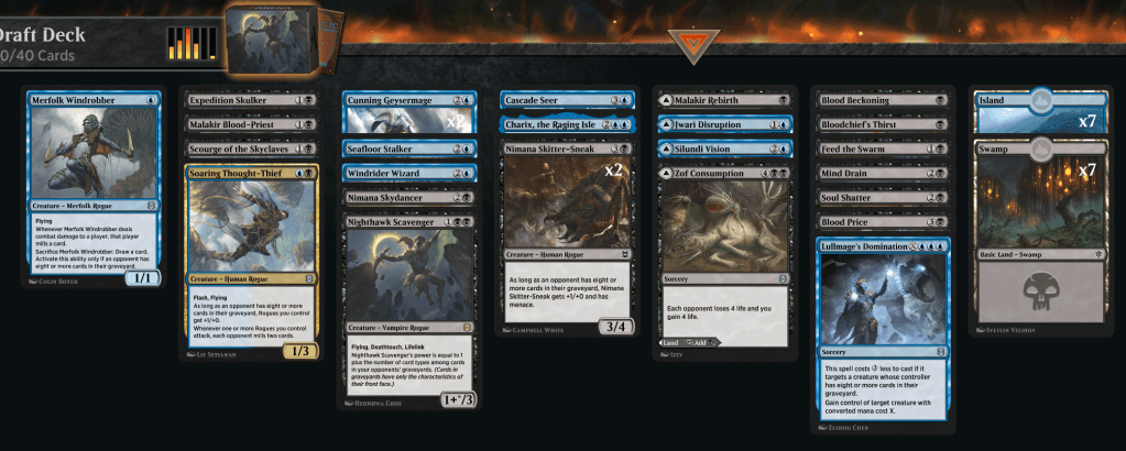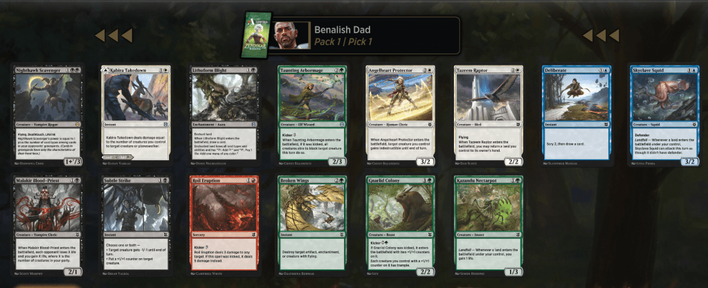 This draft somehow felt weak yet also easy. I went through the log, putting together the head-to-head picks on power vs. fit, and there wasn’t a single interesting choice in the whole lot. So I think I found the right lane, made reasonable choices, and just came out of it with an underpowered deck. Happens.