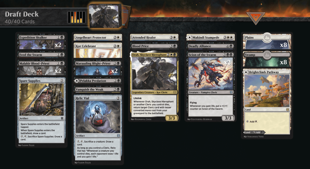 At the end of pack 1, Green feels underdrafted at the table, two lifegain payoffs and very little else. But clerics open up, and I put together a very entertaining cleric-combo deck.