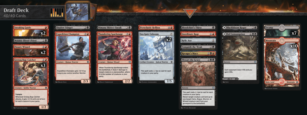 This draft was… awful. Just hard to read. At first it seemed like white might be open with the Apparition and Jerboa but then that dried up so I took some middling red cards. I literally had 5 colors through my first 7 picks. Not great. But I eventually eased into a red/black deck… of sorts.