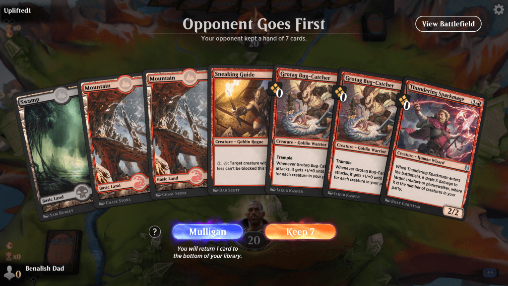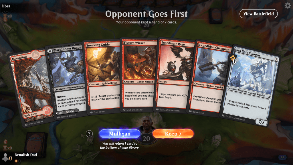 Facing RW warriors. this is an easy keep on the draw. I plan to play the Blackbloom as a swamp unless I draw a swamp. Which I do! I then push my luck, draw enough lands to cast the Colossus on turn 4 which led to a straightforward victory. I did make a mistake where I double-blocked and needlessly dropped my party count to 1, which was foolish and prevented me from closing out the game earlier.