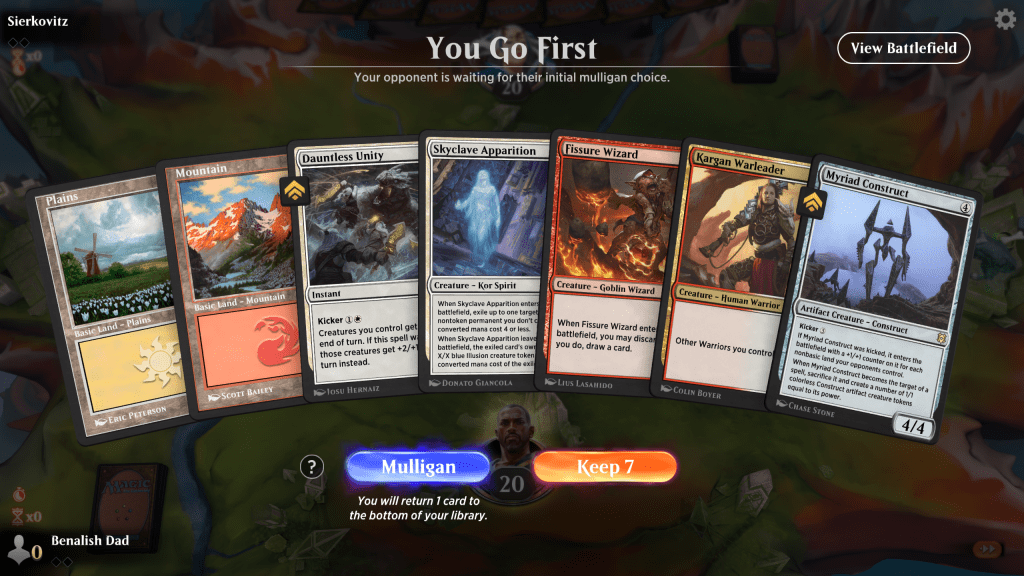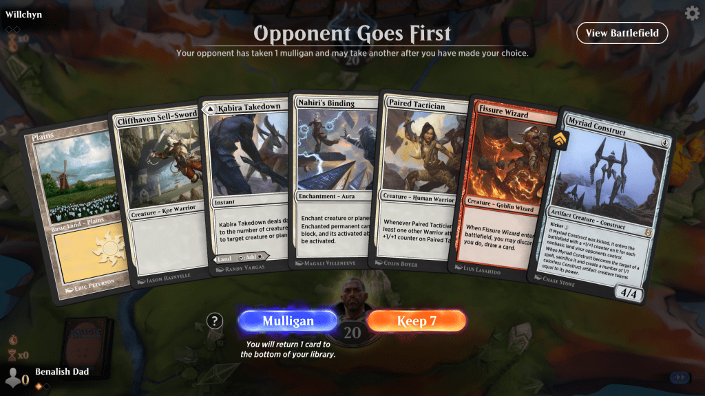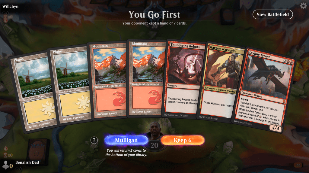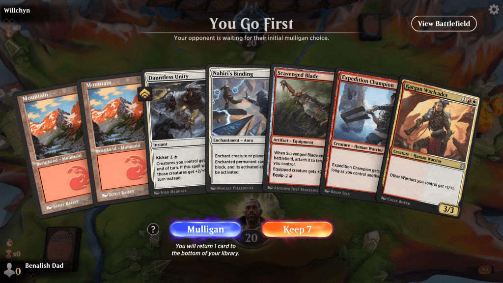 This is a feel bad mulligan. Sure, drawing one land gets my Champion into play. But needing a plains to turn on the hand isn’t great.