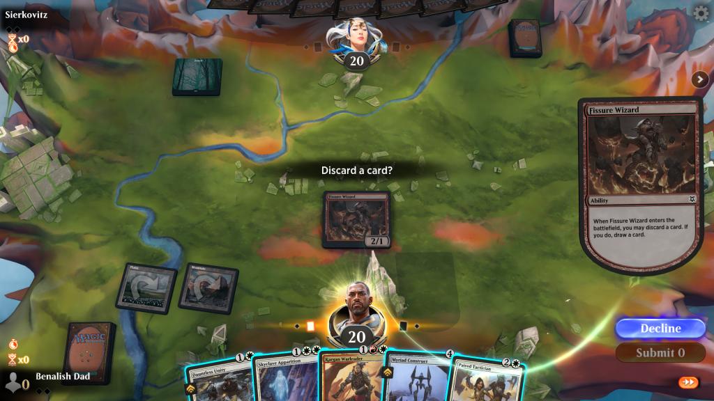 Pretty easy keep. Though the big question: do I rummage with Fissure Wizard? See below! I run over a GB deck with a clean curve two games in a row. Trophy!