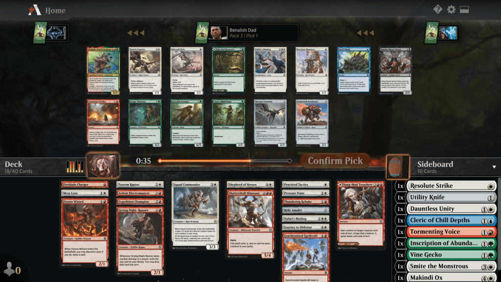 So, there’s a Phylath just sitting there, one of the more powerful cards in the set. Also in contention is the Party Packbeast (party enabler) and Emeria Captain (party payoff). I took the high upside of the captain, though arguably I should have taken the packbeast since I already had two very good party payoffs (Squad Commander and Minotaur). A very close call. The Kitesail Cleric did wheel, which was a nice positive reinforcement that I’m in the right colors. As was the P3p15 Kor Celebrant.