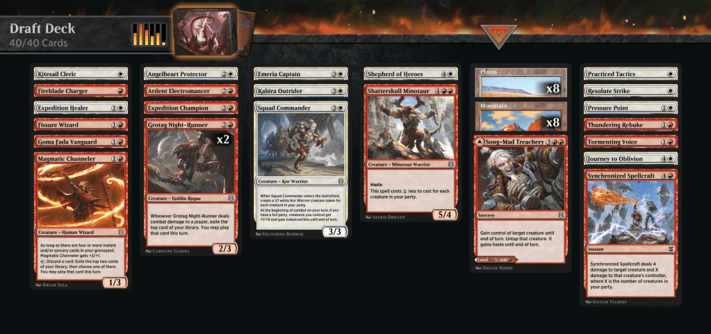 Red/white… party! So with a number of pretty good payoffs, I want to play a little slower, a little more midrange. After the first round, Ir ealized that Kor Celebrant is great in this deck and we’re really not aggressive enough to take advantage of the fireblade charging in.