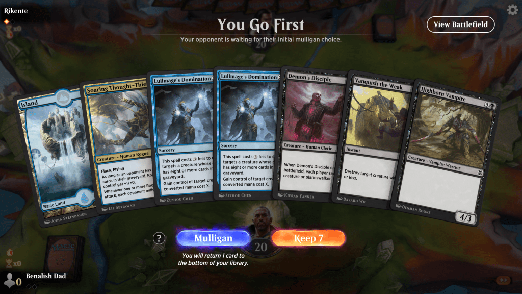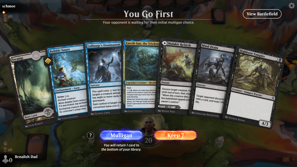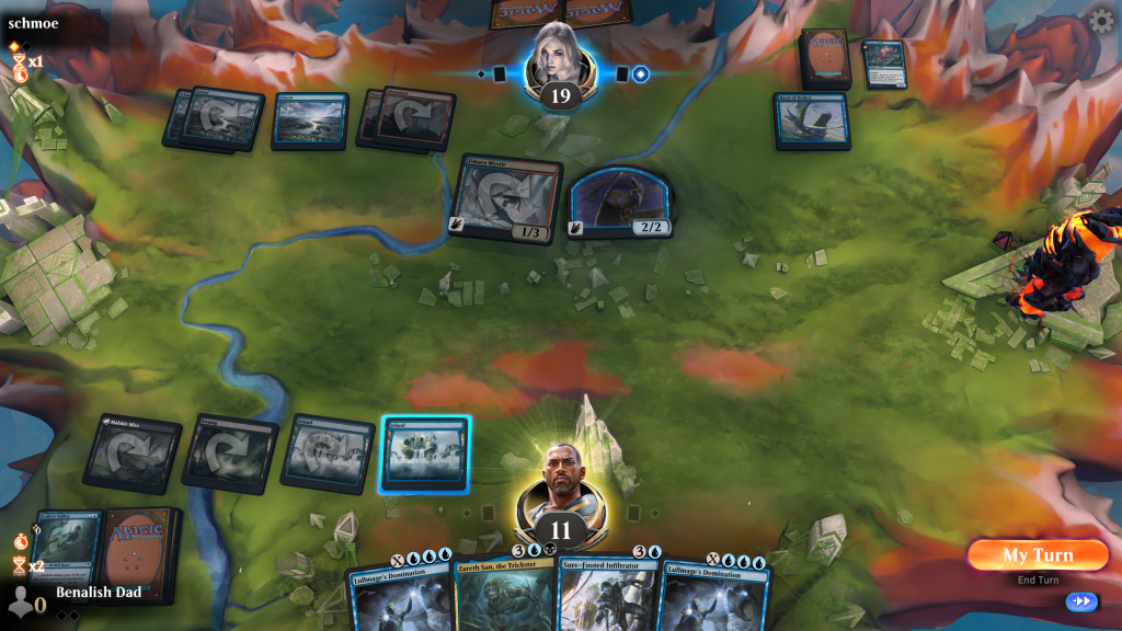 What do I take with the Lullmage’s Domination? Or more accurately: do I burn one of them now to take the drake for 3 mana, or hope I get a land soon to get the more permanent blocker with the 1/3. I do take the drake, but oppo had bounce (which creates more drakes naturally) and it was all over.