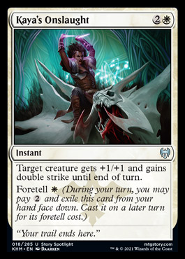 Okay, so basically nothing is safe. White and green have 1-mana plays, with and without foretell. Blue has a bounce spell at 1 mana (when foretold) and a pair of flashes that can impact combat math. Even black has a respectable option at 2-mana. As for red, well as is often the case red’s idea of a combat trick is a burn spell and they have plenty of those.