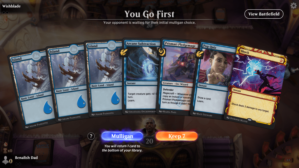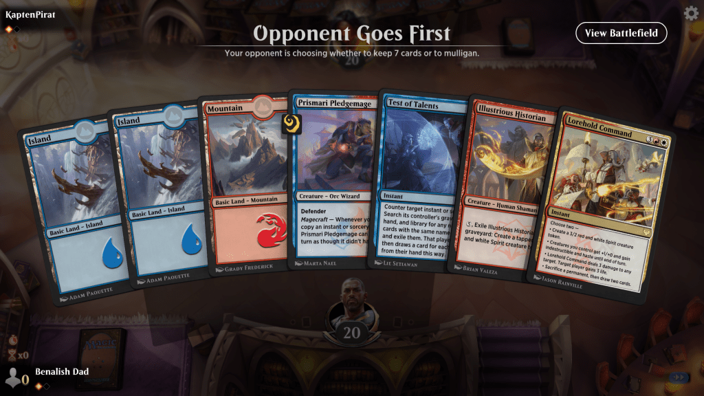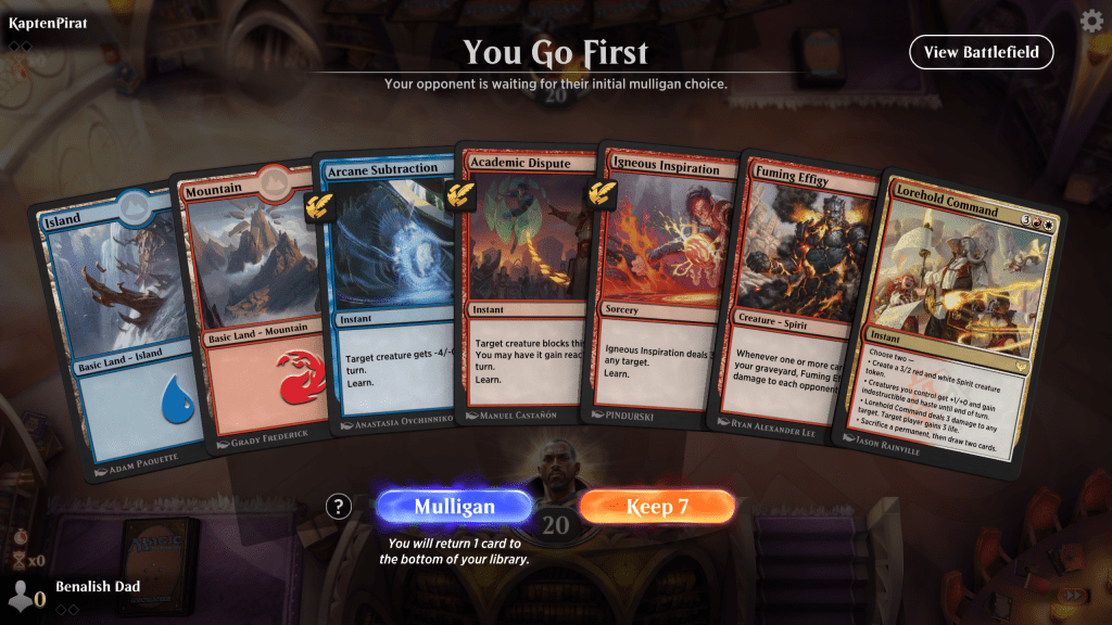 Lacks a good early drop, but lots of interaction and Learn cards makes it a pretty straightforward keep. Look to build to Lorehold Command!