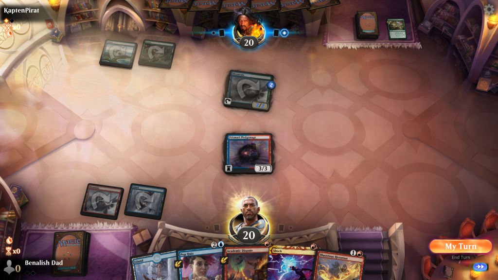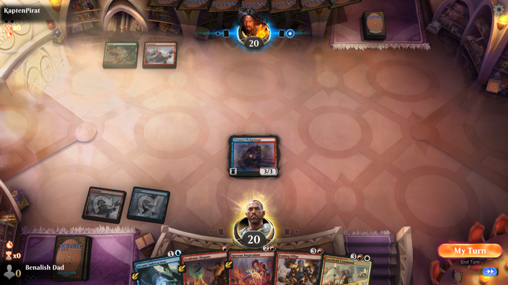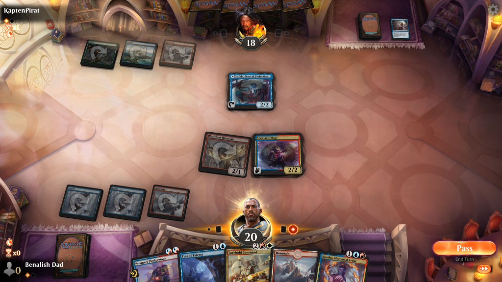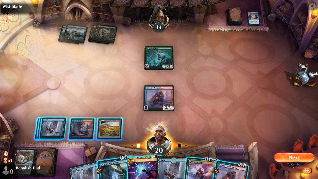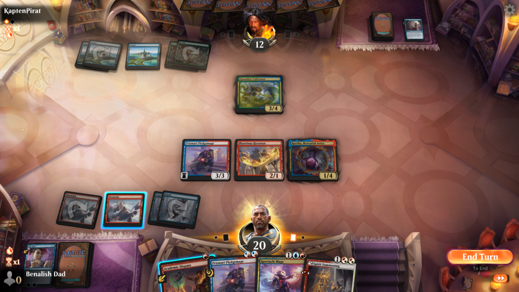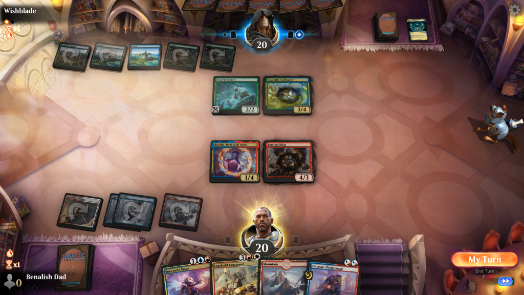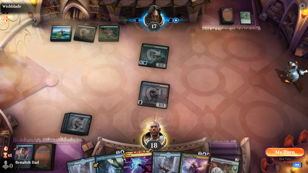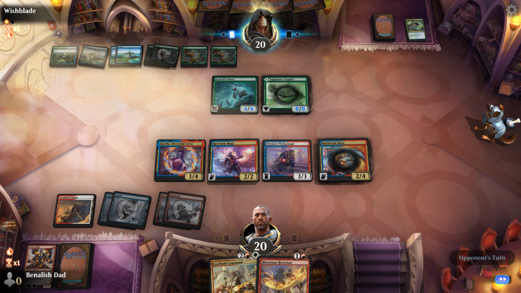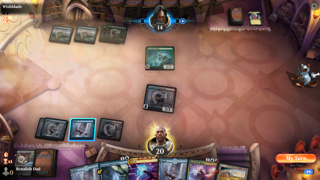 At this stage in the game, Lil Chandra wandered into the room and started reporting on the lifetotals of both players, so documentation suffered. Oppo eventually stabilized and started murdering me with 7 “mana value” spells.