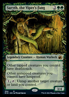 Saryth looks interesting. 3/4 for 4-mana is a solid rate. Turning *everything* (else) into deathtouching attackers is very powerful. Everything (else) being hexproof is very good and being able to untap something (thus turning it hexproof) is also nice. The downside is that if oppo has any removal, it will 100% be targeting Saryth. Once again, what keeps it out of bomb status is not really turning around a losing game.