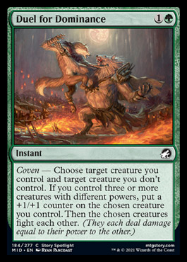 So is this closer to Pounce or to Epic Confrontation? 2-mana at instant speed is nice, but it’s not enough as Pounce was close to unplayable. Once again, it comes down to how often you have Coven. If it’s 100%, then we’re at “best green common” territory. I think WG will have coven enough to make it work. RG werewolves might not have Coven, but it will have enormous 6/6 werewolves who don’t need the help. BG and UG are (shrug emoji). I think this card will see play, but only in some green decks.