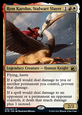 First, a lot of words. But at it’s core it looks like a Skyknight Legionnaire. Flying haste aggressive creature in aggressive colors. Check. But it has this neat passive that weakens any direct damage spells your opponent has while buffing your own. What do we have so far?