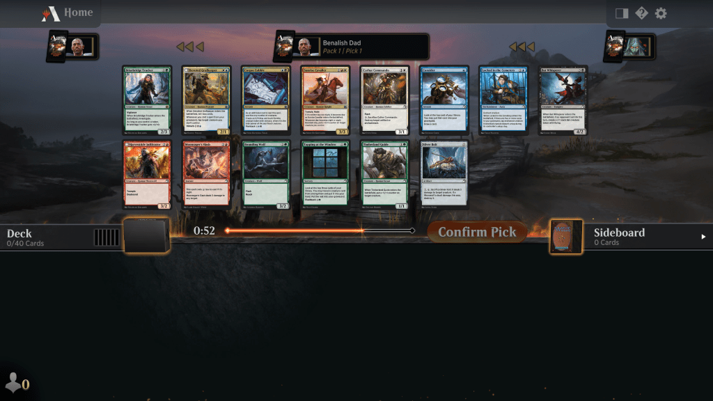 Interesting P1p1. I think it came down to the gold Grafkeeper. Then some powerful blue only to turn into a potential P1p4 Morbid Opportunist, which I will gladly take to move into black. The draft shallowed out a little and then I opened a bomb in pack 2. And I panicked.