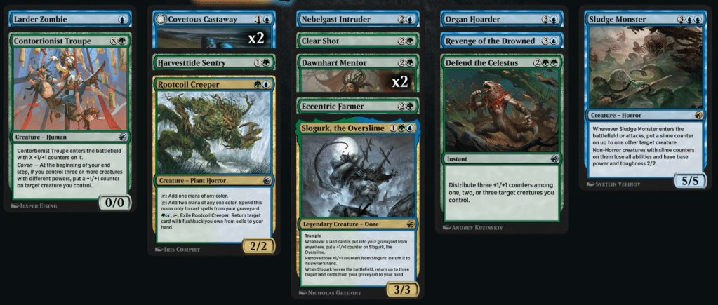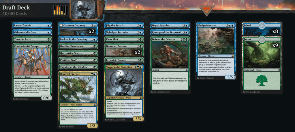What does this deck want to do? Holy graveyard synergies batman! I am turbo-milling myself and looking to get value out of the graveyard via Slogurk, the Castaways etc. Also good sources of recurring value from the Contortionist Troupe, plugging mana into the Dawnheart Mentor, and Sludgey the Sludge Monster.