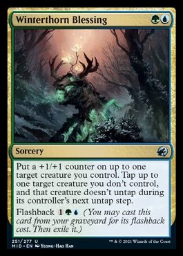 Three choices here. Winterthorn Blessing is a phenomenal tempo card that has flashback to be cast from the graveyard. Duel for Dominance is an okay fight spell that gets significantly better with Coven. Locked in the Graveyard is a bad spell. But if I reliably have a stocked yard, it gets significantly better. So much so, that it goes in over Winterthorn Blessing because this deck wants permanent removal over aggressive tempo plays.