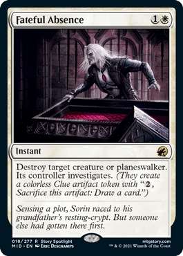 Fateful Absence wasn’t great, as it gives back the card in the form of a clue token. However there was at least one instance where I grossly underutilized it. I sniffed out that the opponent had a trick, but I maximized my mana by casting Silversmith instead of keeping my mana up and gunning for the 2-for-1 by casting my removal in response. A classic example of where the “usually right heuristic” of Maximize Mana wasn’t the best line.