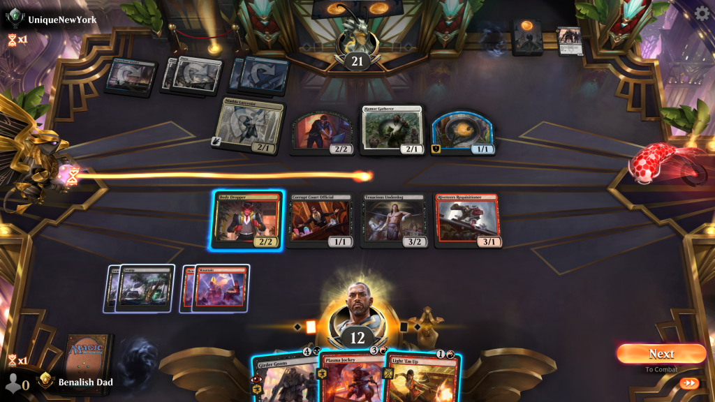 Rule #1 of New Capenna is don’t fall behind, and here I am falling behind! Oppo attacked with a Blitzed Girder Goons and has been steadily pecking away in the air. I draw a Light em Up as medium removal. I have some good Blitz creatures in hand. What’s the play?