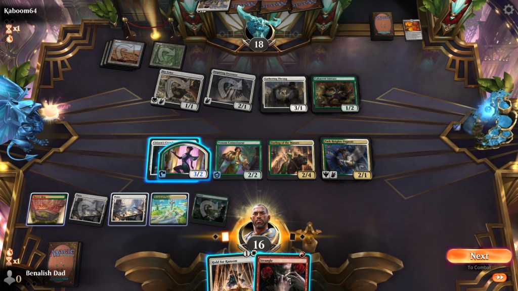 I think I’m favored to win here, so my priority is to remove ways that I lose. One of the clearest ways I lose is if the lifelinker gets bigger and I fall behind in the race. Clear Strangle target. At the opposite end, the 1/2 isn’t really a threat and can safely be ignored. Then, the tiebreaker was “What gets through the most damage” so I Hold for Ransom their Throng. Ultimately they don’t really draw anything and I win pretty easily, but always good to practice good form!