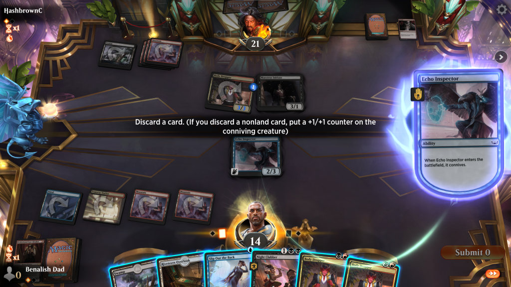 This was one of the better fought games lately. Facing a quasi-Maestros mirror in the rubber match. Oppo got out to a fast start, removed my blocker, and has me pretty firmly on the back foot. But now it’s Echo Inspector time!