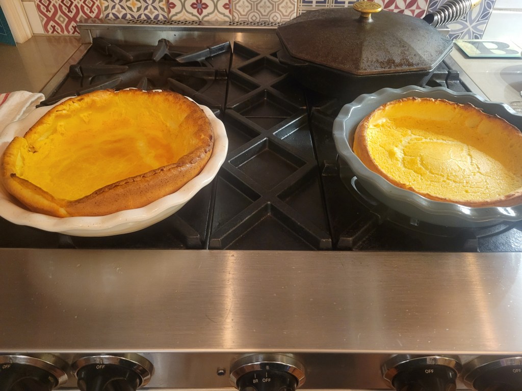 Well I’ll be damned. One the left was 1% milk, and it curled and puffed nicely. On the right: whole milk with no puffing to be seen. I’m sure a real baker can explain why less fat caused less puff, but the results are impossible to argue with. Other Dutch Baby lifehacks: