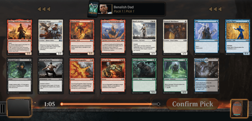Dragonfire vs. Subirais an interesting P1p1. I think Dragonfire is just better, but I thought about it. Waffled through Mardu colors and thought I’d make a go of BW lifegain only for both white AND black being cut in pack 2 (which didn’t feel great). Limped into a decidedly mediocre RW aggro deck.