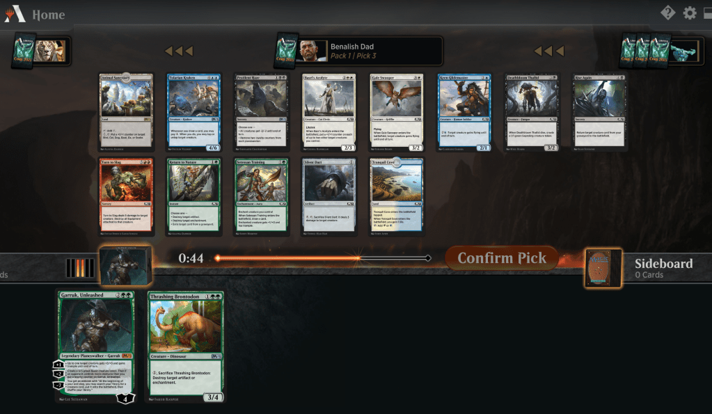 So I’m pretty locked into green with opening Garruk (not a bomb, but Very Good) and a solid Brontodon. Then I get passed a Basri’s Acolyte vs. Setessan Training. ST will make every green deck (high floor, low ceiling kind of card) but Basri’s Acolyte is the nuts in the best deck: GW +1/+1 counters. I went for the Acolyte (white was subsequently quite cut) but I think it’s the right choice. The deck’s performance was not going to be wildly different with another Training.