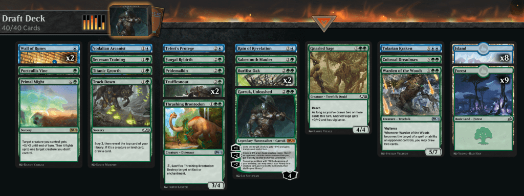 Well *super* embarrassing that I just stone-cold overlooked an Enthralling Hold in P2p5. But green was quite open and I just build a fairly straightforward ramp deck with a blue splash for some removal.