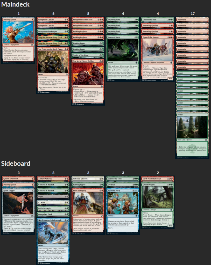 There wasn’t anything really tricky here. All of the two drops and three drops were very powerful. The four drops were just 3x Inspiring Bard which is ideal for a Roper infused Pack Tactics deck. And due to the Goblin lords the five slot was very easy. We didn’t need the dragon as a finisher and green is the worst dragon anyway.