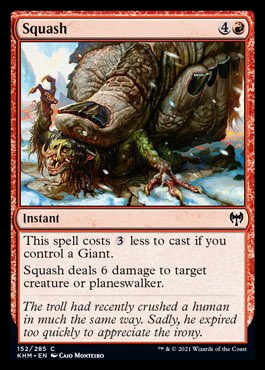 So which direct damage spell is your favorite? Ah red: never change. The first question is how easy will it be to have three snow permanents (note: not JUST snow lands) to upgrade Frost Bite from Shock to OG Lightning Bolt (that can’t go to the face). Demon Bolt being able to pay on the installment plan is a strong contender. And Squash (great name) hinges on how easy it is to get a Giant on the battlefield (red has two at common). The 3-drop that draws you cards (sort of ) for 1 mana I think is going to shockingly overperform, though I don’t think it’ll make the medal podium. Finally, the equipment that is a Short Sword that also pings the opponent could really rack up the damage and enable some attacks. Since red appears to be exclusively turning cards sideways, I think it’ll find a home in every deck.